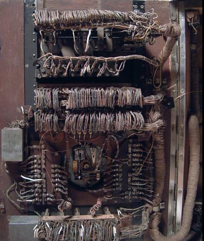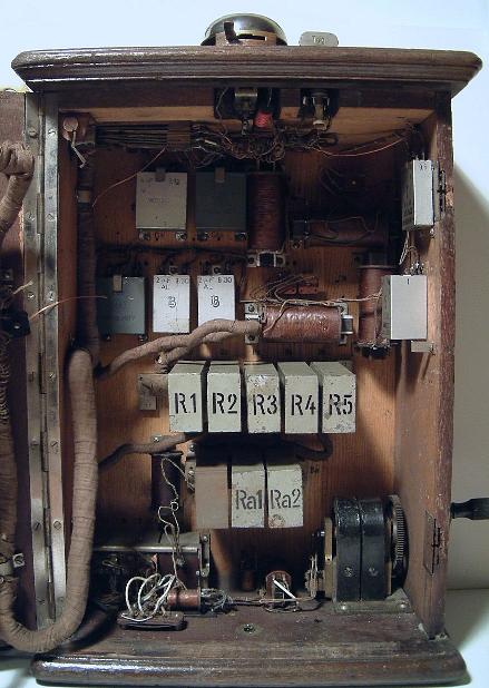 Schrank geöffnet: Wecker, Speisebrücke, diverse Kondensatoren, R1...5 Nebenstellenrelais, (unbenannt) Mithörverhinderungs-Relais, Ra1...2 Amstüberwachungsrelais, Induktionsspule, Mithörspule und Kurbelinduktor